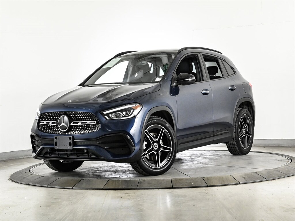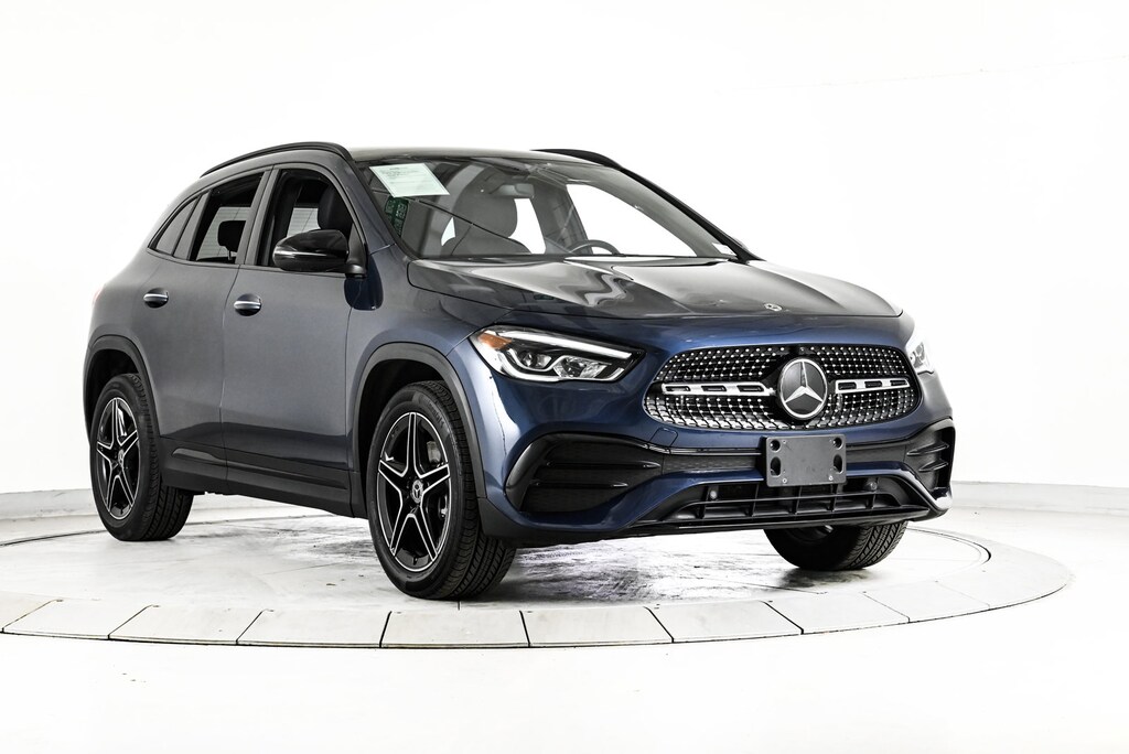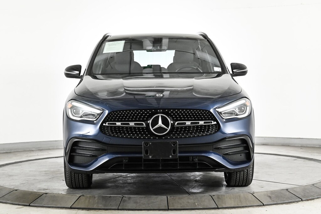 Certified 2023 GLA250W4 All Wheel Drive in Denim Blue Metallic/Black MB-Tex with Dinamica inserts & Red Stitching with Premium Package, AMG Line Package, Night Package, Panorama Sunroof, Heated Steering Wheel, Heated Front Seats, Multi-Color Ambient Lighting, AMG Line Carbon Structure Trim & 19 AMG 5-Spoke Wheels w/Black Accents