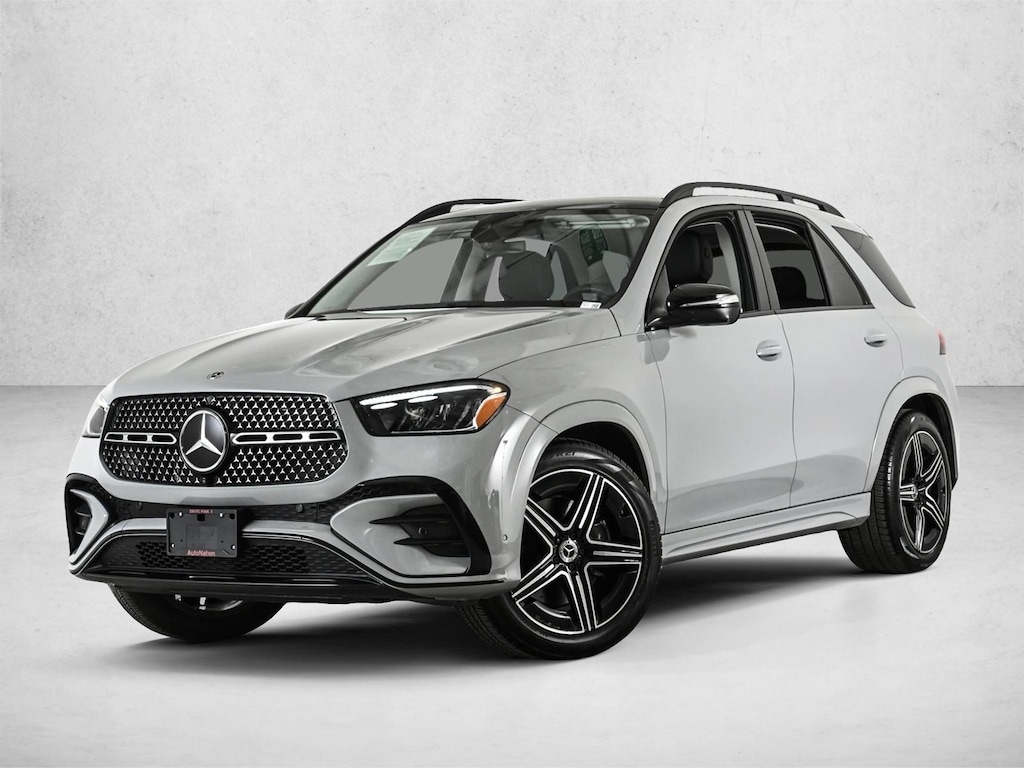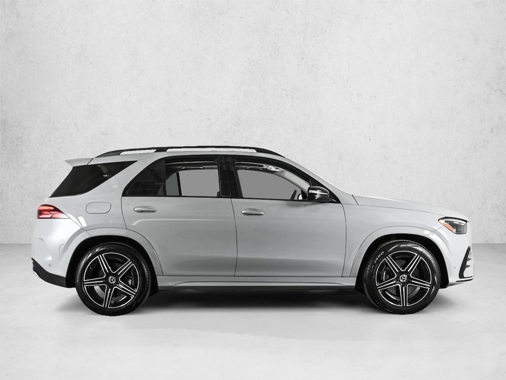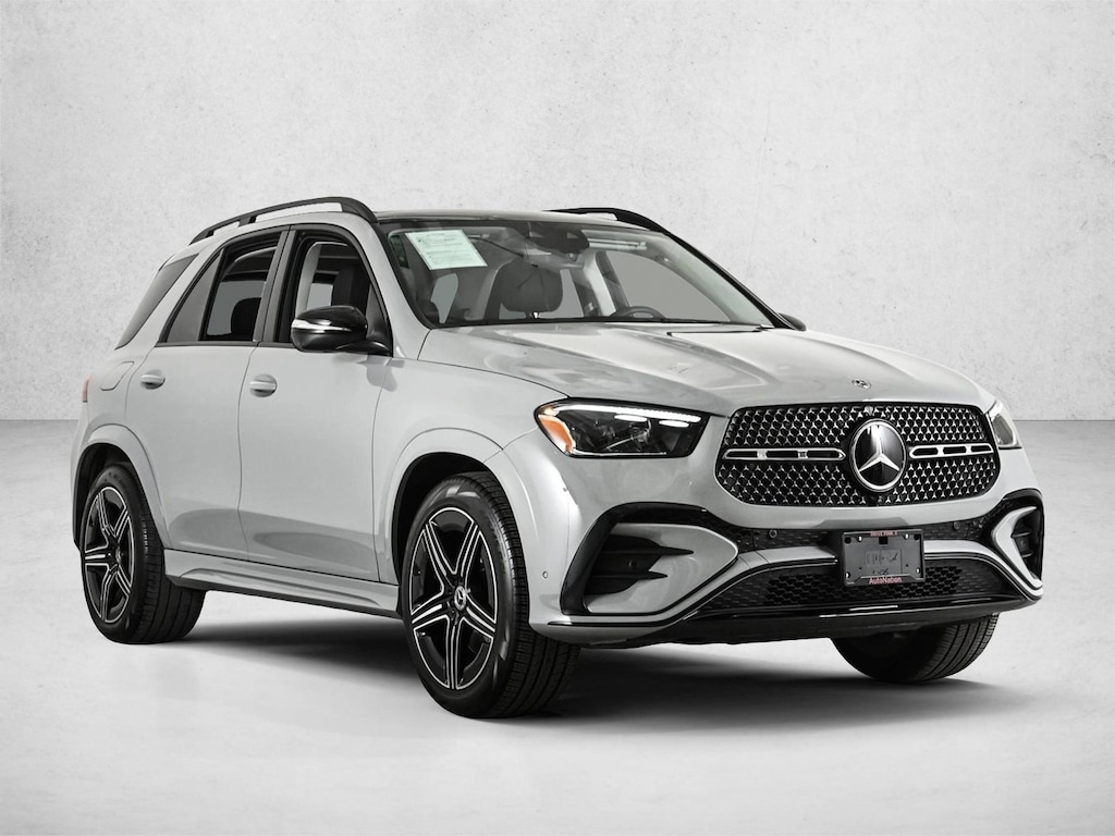 Certified 2025 GLE350W4 All Wheel Drive MANUFAKTUR Alpine Grey/Black MB-Tex with Exclusive Trim, AMG Line Exterior Package, Night Package, Driver Assistance Package, Panorama Sunroof, Trailer Hitch, Winter Package, Roof Spooler/Body Color, Load Sill Protector, Natural Grain Brown Walnut Trim & 21 AMG 5-Spoke Wheels